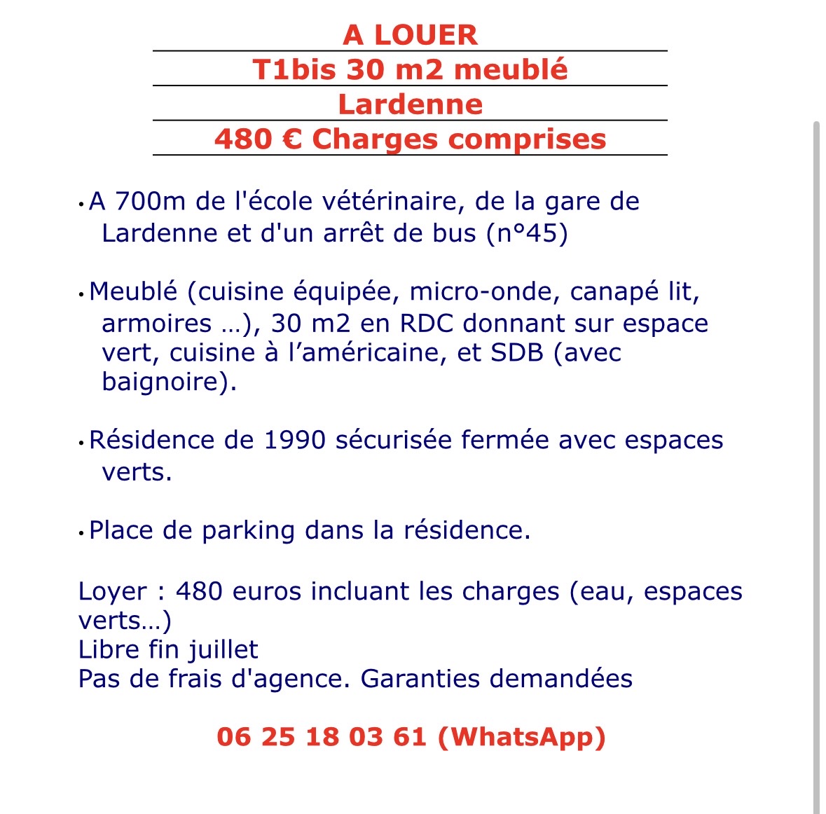 | 12/25 | T2 lardenne 33 m2 avec terrasse | Bonjour, Nous mettons en location un T2 situé à Lardenne, dans un secteur idéal : à proximité de l’école vétérinaire, de Météo France et de l’école de police. |